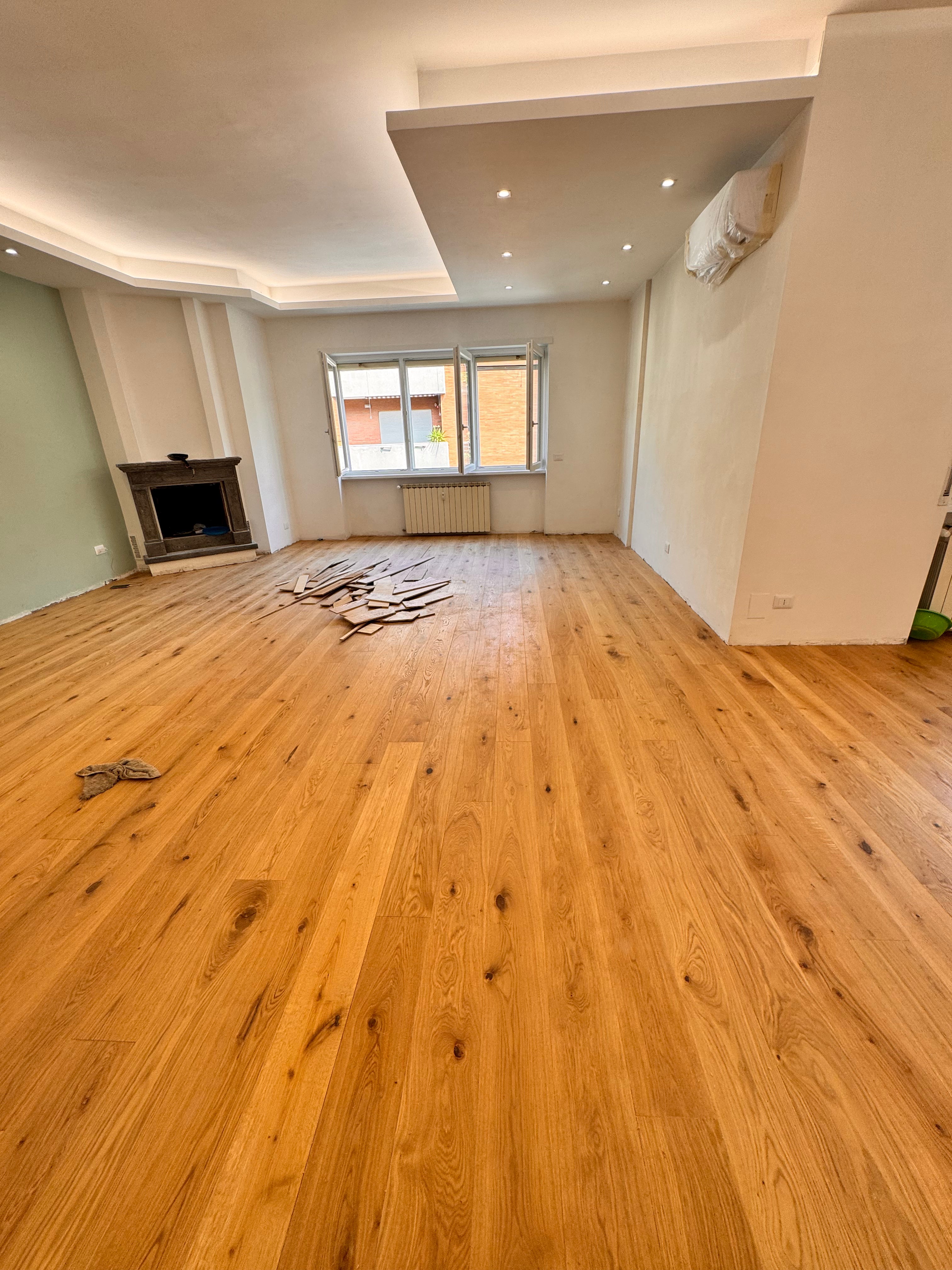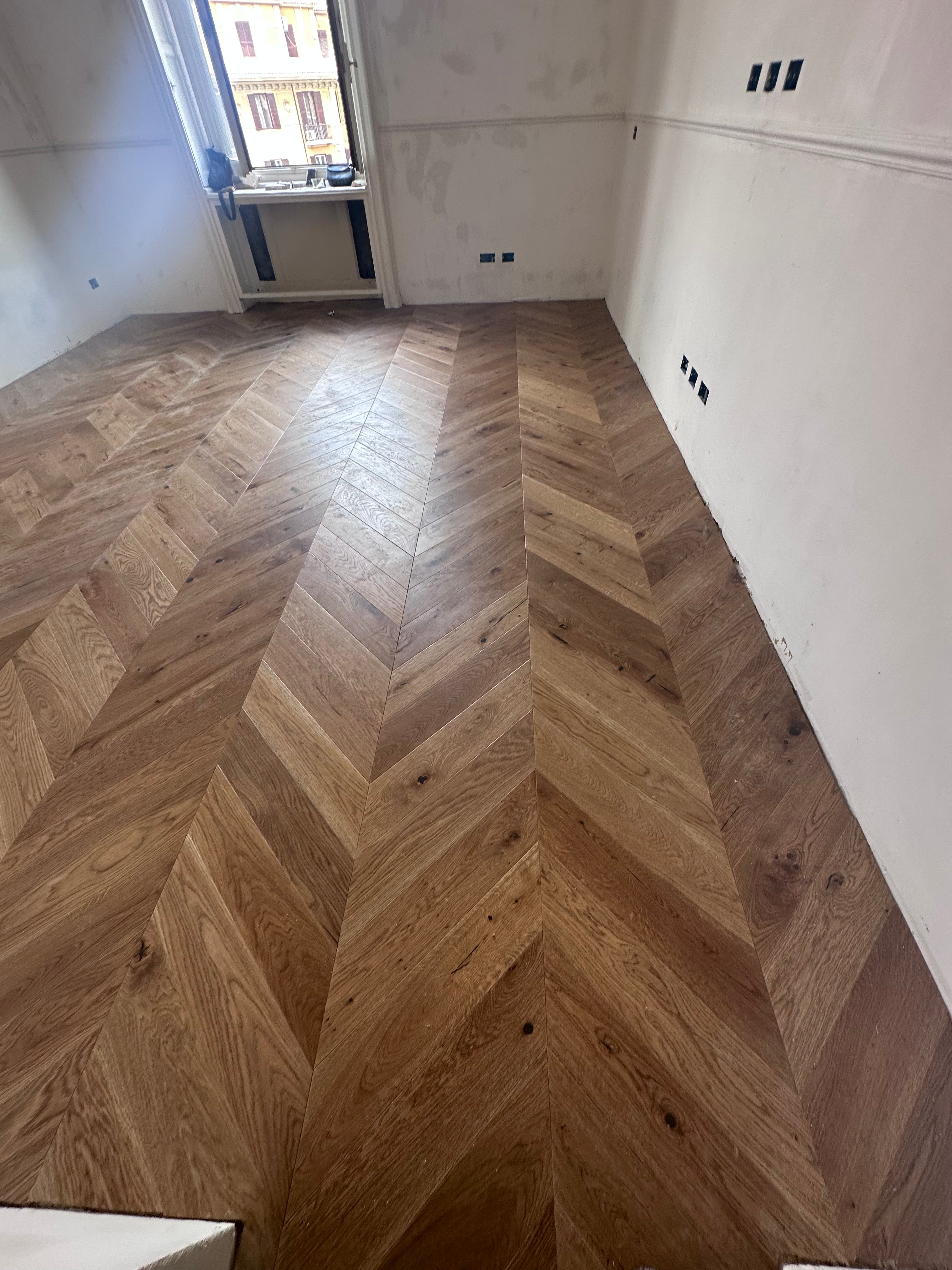 Lavoro realizzato in collaborazione con il cliente, con posa artigianale del parquet e cura maniacale dei dettagli esecutivi. Un intervento che unisce tecnica, esperienza e passione per il legno.