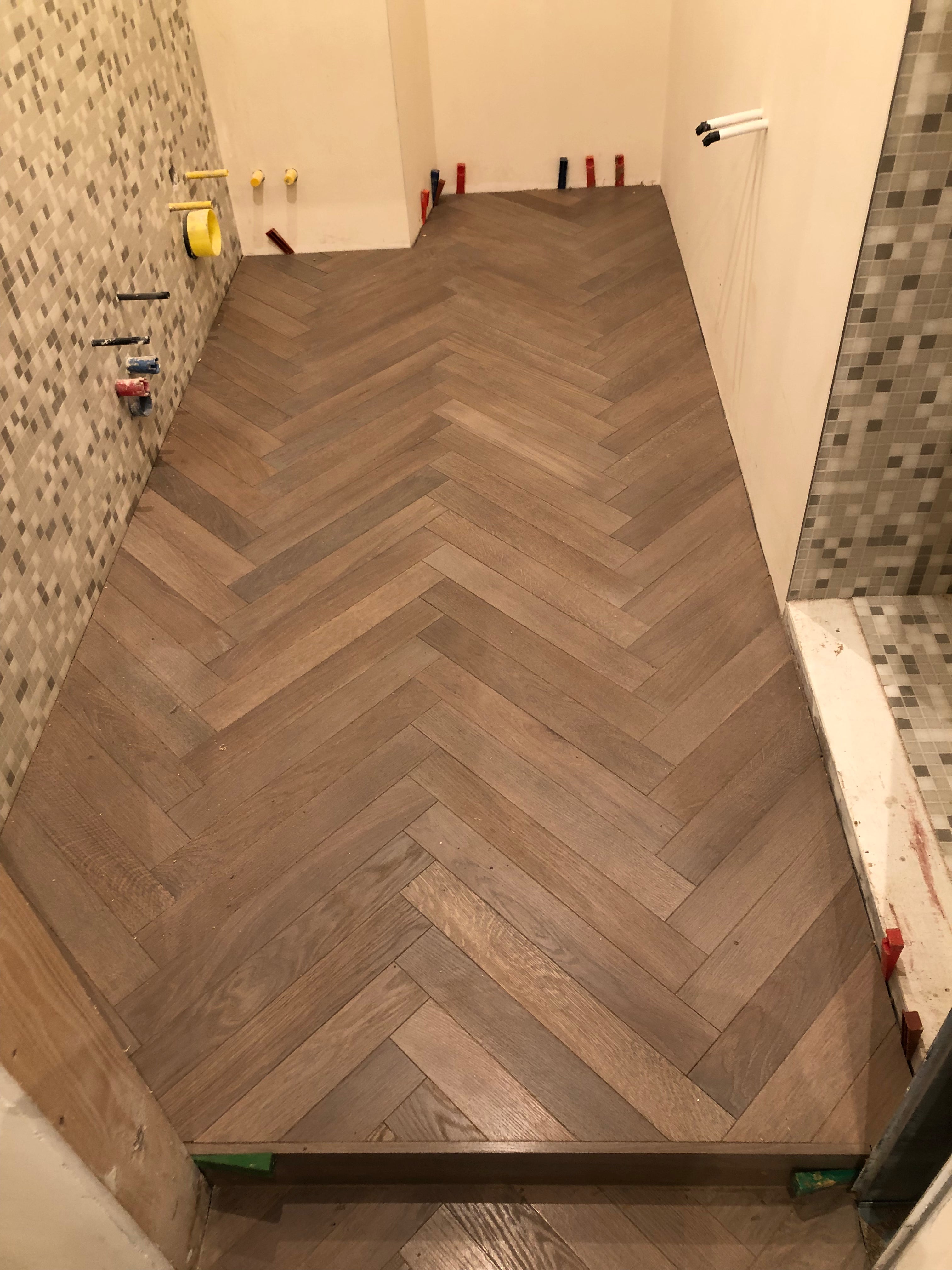 Intervento su appartamento residenziale con posa di parqueta spina Francese, studiato per valorizzare spazi moderni e luminosi.